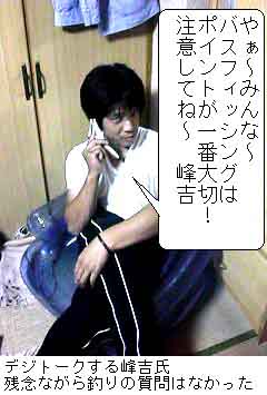 毎週かならず釣りに行ってらっしゃる峰吉先生。 最初は冗談だと思っていたわたくしも、なにやら本当に先生に見えてきました。 いつか、先生に実技講習会開いて欲しいっす。 そしたらデジッコのみんなも、デジチャットを休憩して弟子入りすると思いますよ〜〜〜(笑) (弟子のヒトリゴト) |